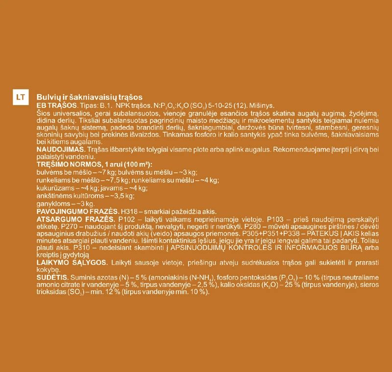 Zīmols- Garden Center. Svars- 10 kg. Mēslošanas līdzekļa veids- Granulēts. Paredzēts sezonai- Pavasaris. Sastāvs- Uz iepakojuma.. Uzmanību!- Lietojiet saskaņā ar norādījumiem un paredzēto lietošanas instrukciju. Uzglabāt cieši noslēgtā, sausā un vēdināmā vietā, bērniem un mājdzīvniekiem nepieejamā vietā.. Derīguma termiņš- Neierobežots, ja uzglabā pareizi.. Obligātā garantija- 24 mēn. Garantija juridiskām personām- 12 mēn. Papildus informācija- Minerālmēsli ar mikroelementiem, kuru sastāvā ir kalcijs, magnijs, sērs un citas kartupeļu audzēšanai augsnē nepieciešamās barības vielas. Mēslojuma granulas vienmērīgi iestrādā augsnē vai izkaisa uz augsnes. Ieteicams mēslot, kad augsne ir mitra. Vienam aram vidēji nepieciešami 7 kg mēslojuma. Centieties nepārmēslot, ievērojiet ieteicamās mēslojuma lietošanas normas..