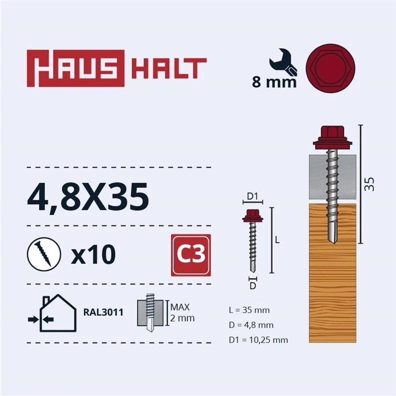 Preču zīmols- Haushalt. Pašvīdēšanas skrūvju tips- Ar urbju. Garums- 35 mm. Diametrs- 4.8 mm. Pārklājums- Cinkots. Krāsots. Piestiprināmā materiāla- Koks. Standarts- DIN 7504K. Vienības iepakojumā- 10. Papildus informācija- Sarkanā - RAL3011. .