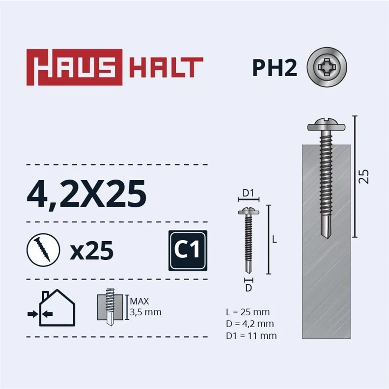 Zīmols- Haushalt. Pašskrūvējošais tips- Ar uzgriezni. Garums- 25 mm. Diametrs- 4.2 mm. Pārklājums- Cinkots. Iespējamais materiāls- Metāls. Standarta- DIN 14566. Vienību skaits iepakojumā- 25.