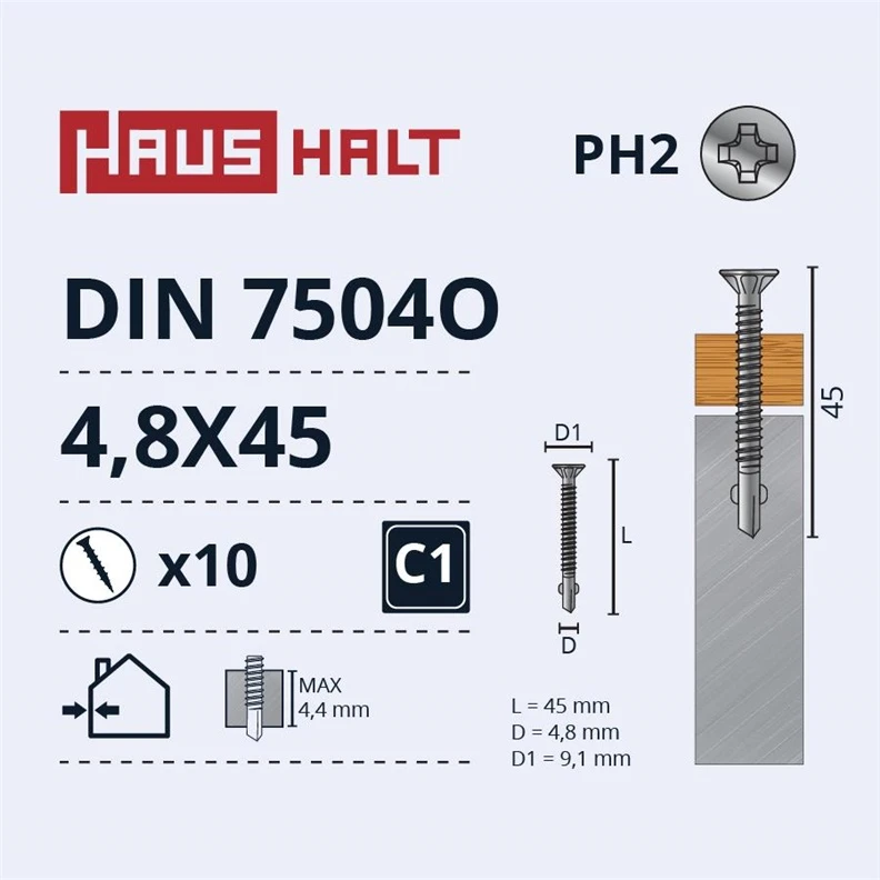 Zīmols- Haushalt. Artikuls- DIN 7504O. Pašskrūvējošais tips- Ar uzgriezni. Garums- 45 mm. Diametrs- 4.8 mm. Pārklājums- Cinkots. Iespējamais materiāls- Koks, Metāls. Standarta- DIN 7504O. Vienību skaits iepakojumā- 10.