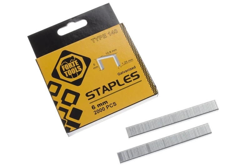 Zīmols- Forte Tools. Artikuls- 1006HD. Garums- 10.8 mm. Platums- 1.25 mm. Krāsa- Sudraba. Materiāls- Metāls. Vienību skaits iepakojumā- 2000. Skavas / Vītnes tips- 140. Papildus informācija- Materiāls: Nerūsējošais tērauds.