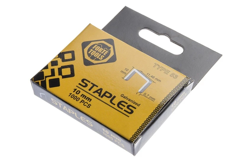 Zīmols- Forte Tools. Garums- 11.46 mm. Platums- 0.7 mm. Krāsa- Sudraba. Materiāls- Cinkotais tērauds. Vienību skaits iepakojumā- 1000. Skavas / Vītnes tips- 53.