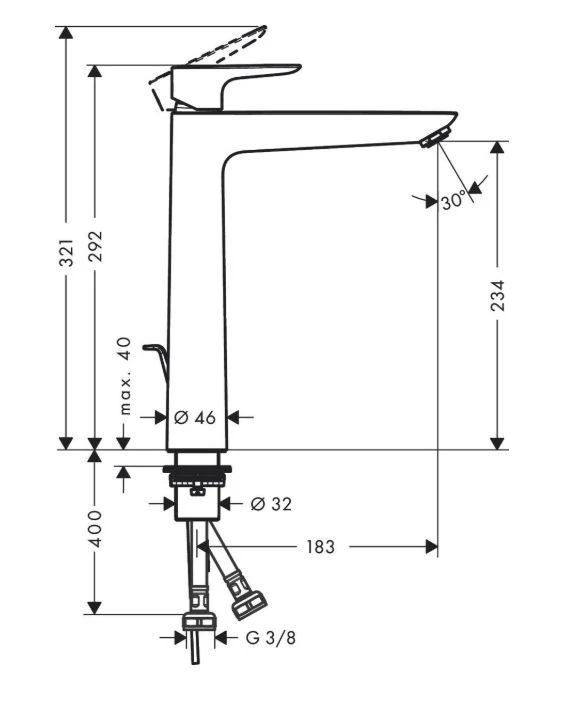 Zīmols- Hansgrohe. Montāžas tips- Stiprināms uz virsmas. Garums- 18.3 cm. Platums- 4.6 cm. Svars- 3.27 kg. Augstums- 32.1 cm. Krāsa- Melna. Materiāls- Metāls. Savienotājs- G3/8. Caurplūdes koeficients- 5 l/min. Rokturu skaits- 1. Izvelkamas galvas- Nē. Pamatnes vārsts komplektā- Jā. Obligātā garantija- 24 mēn. Komplekts- Apakšējais vārsts.. Papildus informācija- Augstums: 29.2 cm.