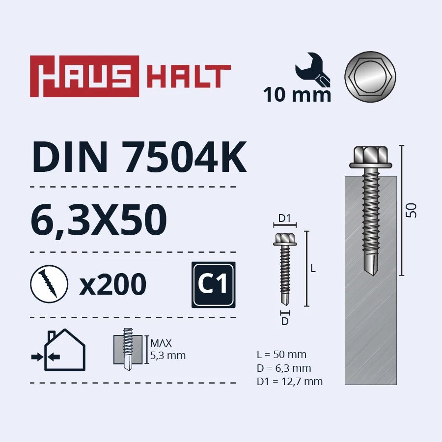 Zīmols- Haushalt. Artikuls- DIN 7504K. Pašskrūvējošais tips- Ar uzgriezni. Garums- 50 mm. Diametrs- 6.3 mm. Pārklājums- Cinkots. Iespējamais materiāls- Metāls. Standarta- DIN 7504K. Vienību skaits iepakojumā- 200.