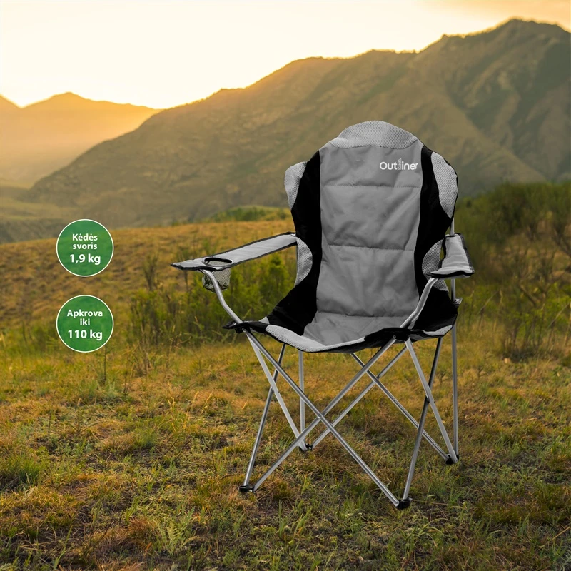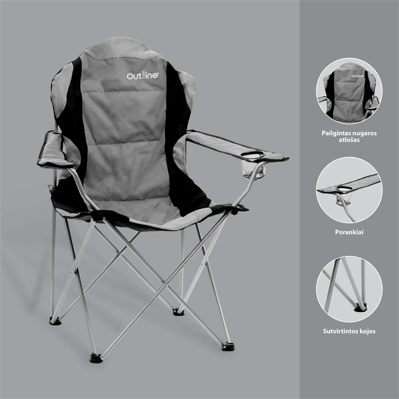 Zīmols- Outliner. Artikuls- YXC-605. Krāsa- Melna, Pelēka. Krēsla garums- 60 cm. Krēsla platums- 66 cm. Krēsla augstums- 104 cm. Salocītas mēbeles garums- 15 cm. Salocītas mēbeles platums- 15 cm. Salocītas mēbeles augstums- 104 cm. Svars- 3.4 kg. Sēdvietas materiāls- Poliesters. Rāmja materiāls- Tērauds. Ar roku balstiem- Jā. Saliekamais krēsls- Jā. Krēsla polsterējums- Nē. Transporta soma- Jā. Ar glāzes turētāju- Jā. Maksimālais lietotāja ķermeņa svars- 120 kg. Obligātā garantija- 24 mēn. Papildus informācija- Sēdekļa augstums: 49 cm.