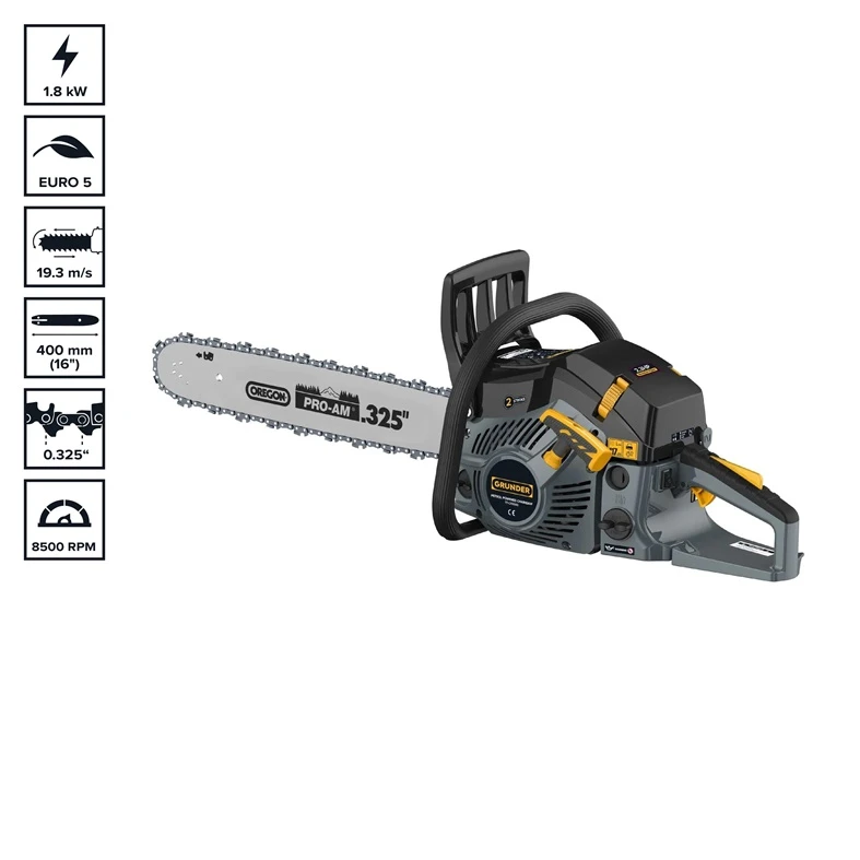 Zīmols- Grunder. Artikuls- TT-CS5500. Jauda- 1800 W. Svars- 6.5 kg. Ķēdes zāģa tips- Benzīna. Sliedes garums- 40 cm. Ķēdes biezums- 1.3 mm. Ķēdes posmi- 0.325". Dzinēja tips- Divtaktu benzīna. Dzinēja cilindra tilpums- 51.5 cm³. Degvielas tvertnes tilpums- 0.55 l. Degvielas sūknis- Jā. Anti-vibrācijas sistēma- Nē. Trokšņa līmenis- 117 dB. Ķēdes zāģa komplektācija- Ķēde, Zāģa sliede, Degvielas un eļļas tvertnes, Zāģis. Obligātā garantija- 24 mēn.
