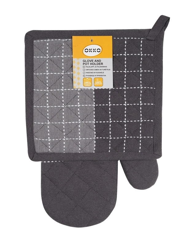 Zīmols- Okko. Artikuls- PMM/G14146R. Garums- 18 cm. Platums- 31 cm. Krāsa- Grafīta. Auduma sastāvs- 100% kokvilna. Papildus informācija- Komplektā: 1 gab. kauss: 20 x 20 cm, 1 gab. cimds: 18 x 31 cm..