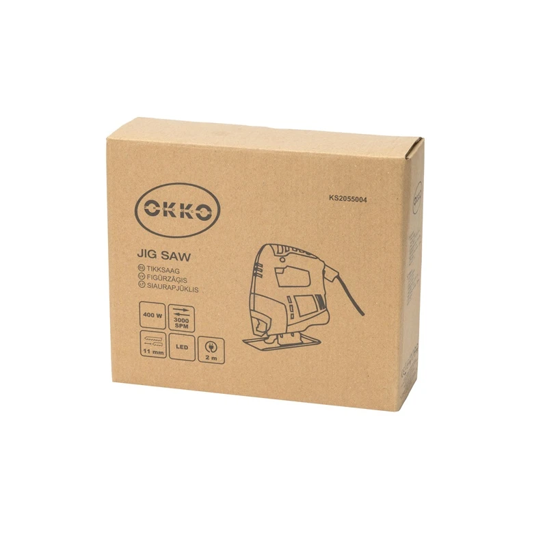 Gājienu skaits minūtē - 3000. Regulējams gājienu ātrums - Nē. Šūpoles kustība - Nē. Obligātā garantija - 24 mēn. Preču zīme - Okko. Artikuls - KS2055004. Svars - 2.3 kg. Jauda - 400 W. Elektromotoru tips - Ar suku. Maksimālais zāģējamās koksnes biezums - 50 mm. Papildu informācija - Elektriskais šaurzāģis.