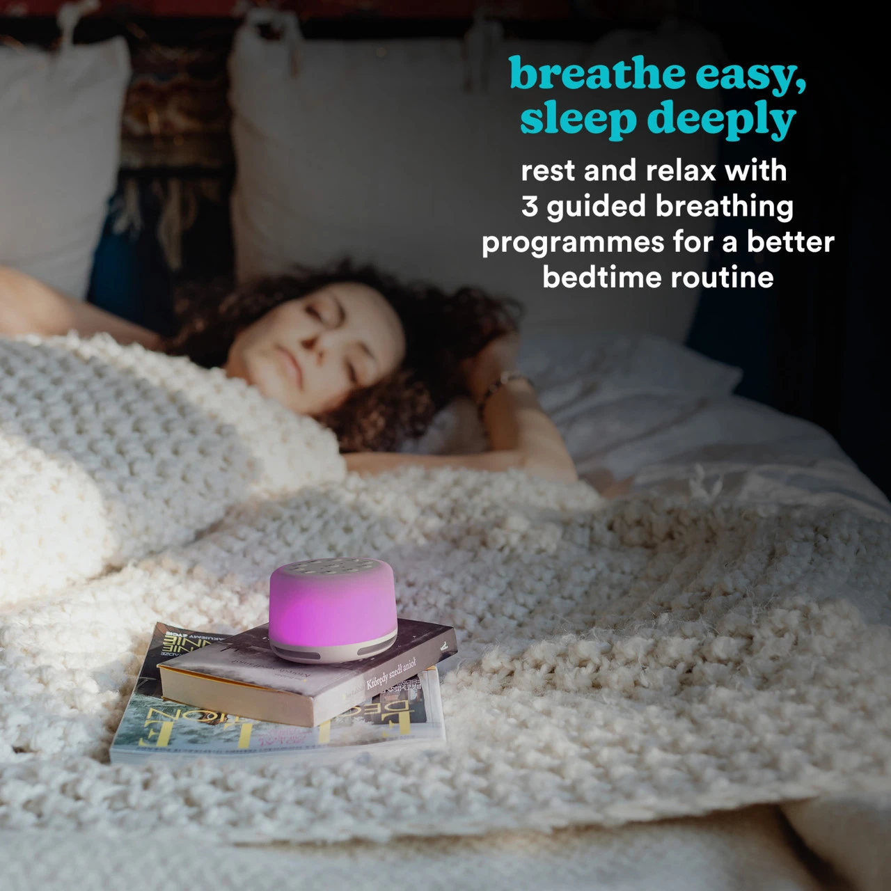 3 vadītas elpošanas programmas un 3 automātiskās izslēgšanās taimeri (30, 60 vai 90 minūtes)