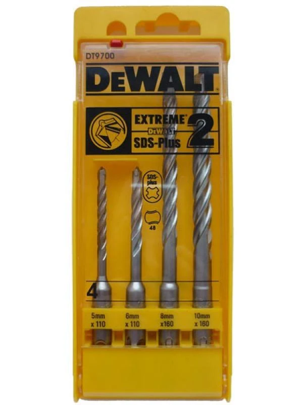 Zīmols- Dewalt. Artikuls- DT9700-QZ. Garums- 16 cm. Diametrs- 5 mm, 6 mm, 8 mm, 10 mm. Svars- 0.56 kg. Materiāls- Tērauds. Montāžas veids- SDS Plus (TE-C). Komplekts- 5mm x 110mm; 6mm x 110mm; 8mm x 160mm & 10mm x 160mm. Apstrādes materiāls- Betons. Obligātā garantija- 24 mēn. Garantija juridiskām personām- 12 mēn. Papildus informācija- Komplekts: 5mm x 110mm; 6mm x 110mm; 8mm x 160mm & 10mm x 160mm.