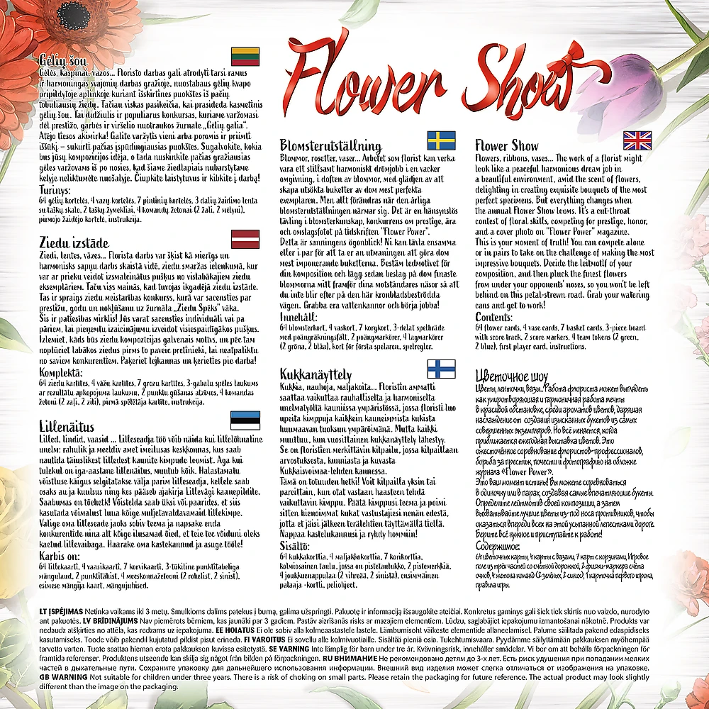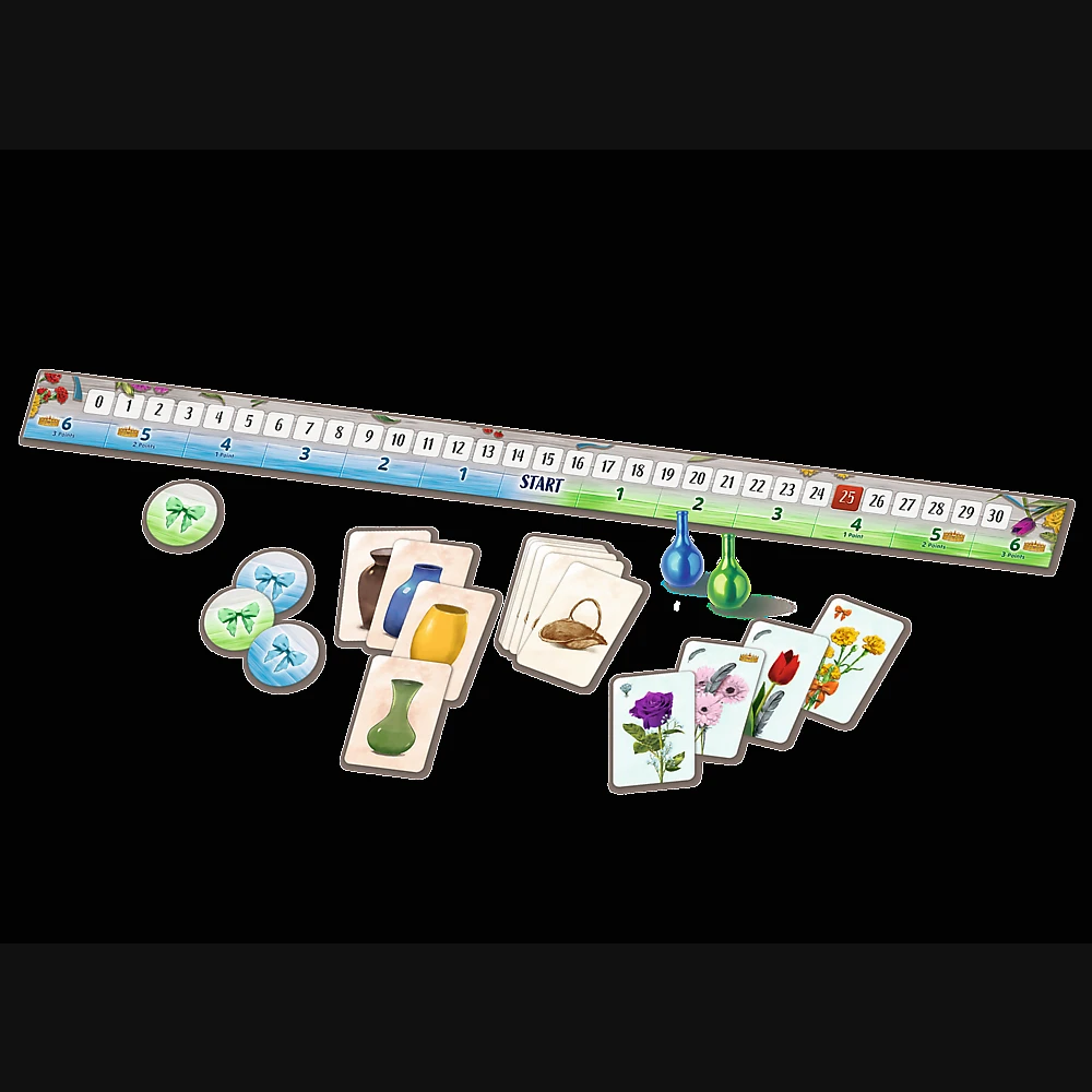 64 ziedu kartītes, 4 vāžu kartītes, 7 grozu kartītes, 3-gabalu spēles laukums ar rezultātu apkopojuma laukumu, 2 punktu gūšanas atzīmes, 4 spēlētāja palīdzības kartītes, 4 komandas žetoni (2 zaļi, 2 zili), pirmā spēlētāja kartīte, instrukcija.