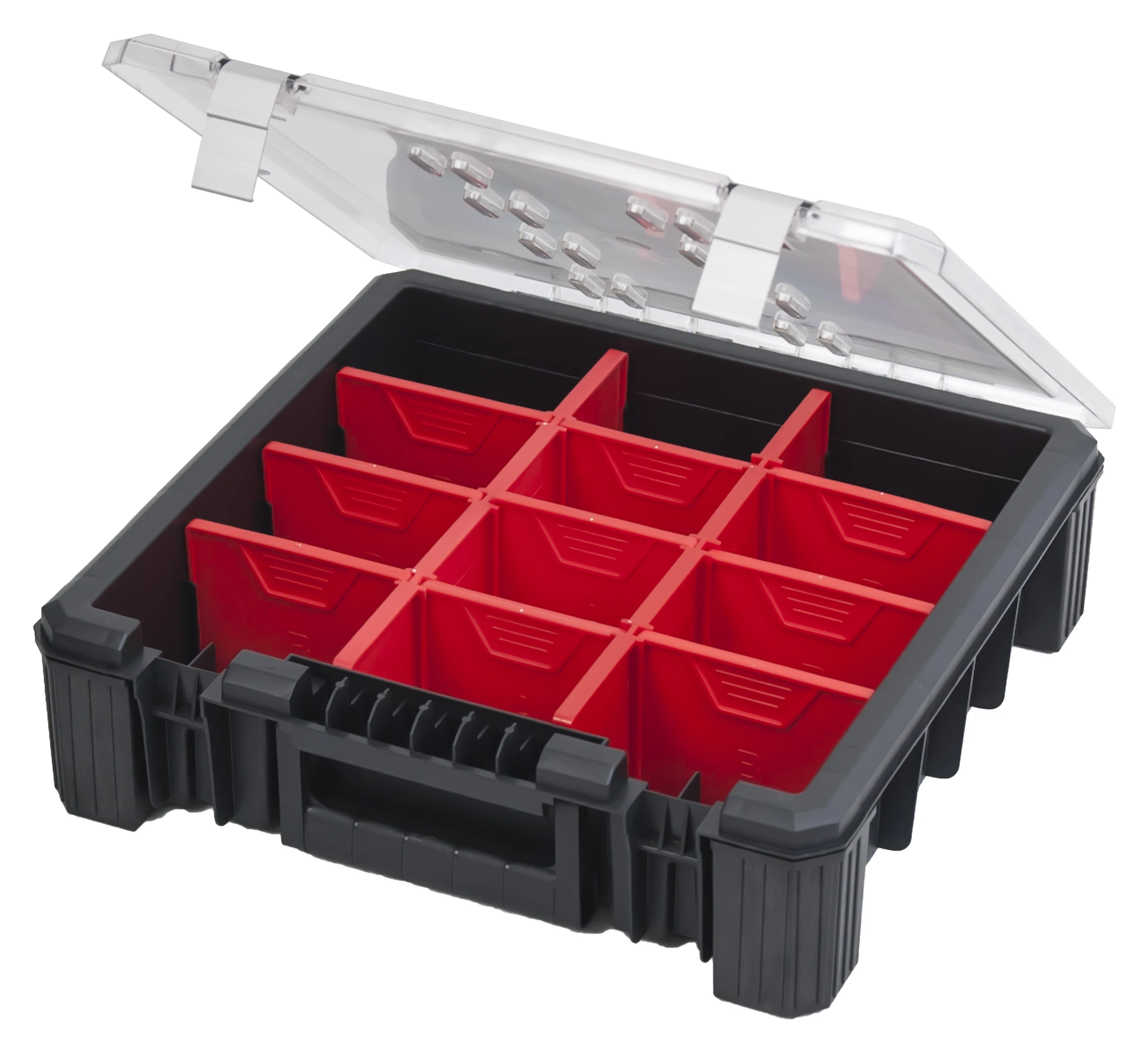 Futlāris sīkumiem HD Flex 400 ar polikarbonāta vāku, prettriecienu stūriem, alumīnija aizbīdņiem un regulējamiem sadalītājiem. Futlāra izmērs 390 x 400 x 110 mm.