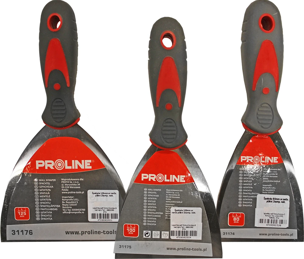 Stingra špakteļlāpstiņa, piemērota skrāpēšanai. Darba daļa izgatavota no pulēta nerūsējošā tērauda, rokturis no neslīdoša divkomponentu materiāla.