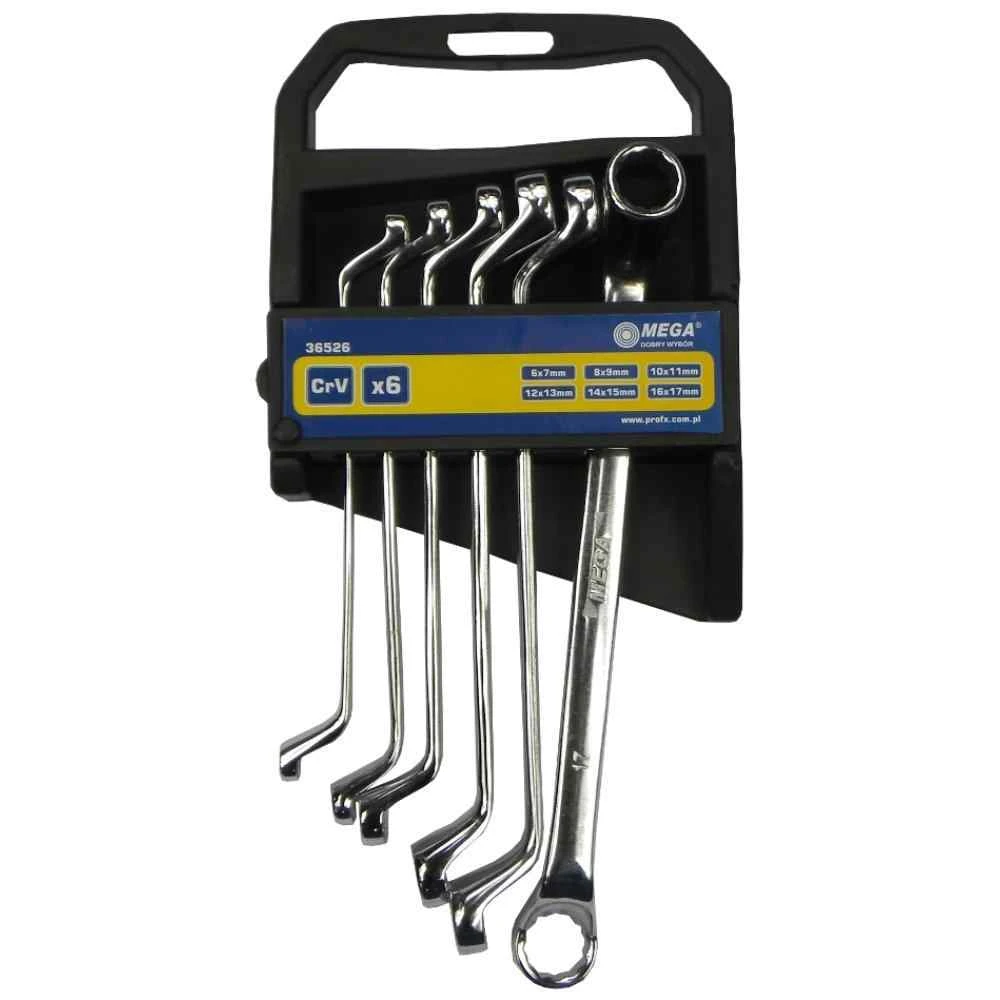 Leņķveida uzmaucamo uzgriežņu atslēgu komplekts. Izgatavotas no augstas kvalitātes hroma vanādija tērauda. Hromētas un slīpētas. Kompektā ietilpst 6 x 7 mm, 8 x 9 mm, 10 x 11 mm, 12 x 13 mm, 14 x 15 mm, 16 x 17 mm atslēgas.