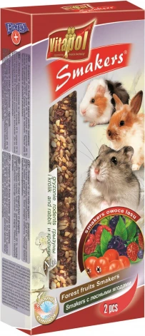 STANDARD Smakers forest fruits Vitapol Nūjiņas ar meža ogām. Papildbarība grauzējiem un trušiem. Sastāvdaļas: augļi 45%, graudaugi 35%, beķerejas izstrādājumi 20%. Analītiskās sastāvdaļas: kopproteīns 11.2%; koptauki 4%; koppelni 5.6%, kopšķiedras 8.7%.