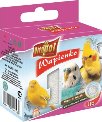 MINERAL BLOCK natural for birds Vitapol minerālu akmens naturāls. Papildbarība putniem. Sastāvs: minerālvielas 100%. Analītiskās sastāvdaļas: koppelni 78.5%, kalcijs 20%; fosfors 1.5%.