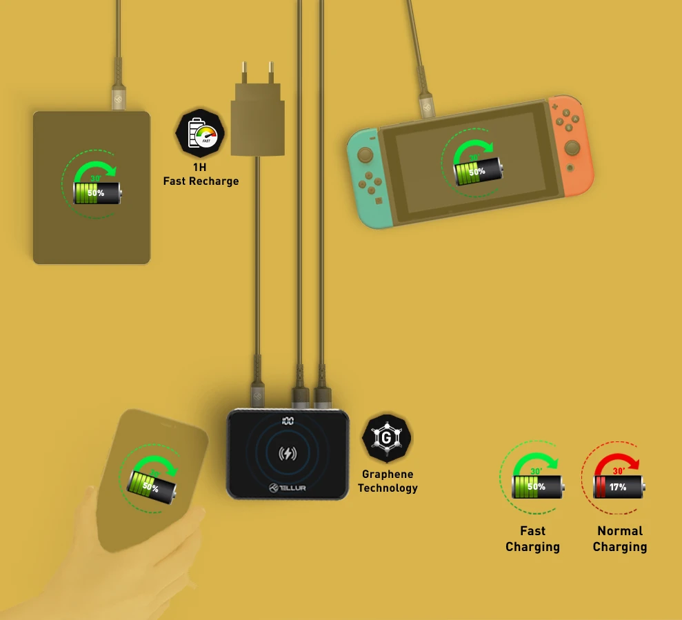 Funkcijas: Revolucionāra grafēna tehnoloģija, Digitālais displejs, ātrā uzlāde, Vienlaicīgi uzlādējiet 3 tālruņus - vienu bezvadu režīmā un divus ar ātro uzlādi, Sienas lādētājs ar ASV, ES un Lielbritānijas spraudņiem