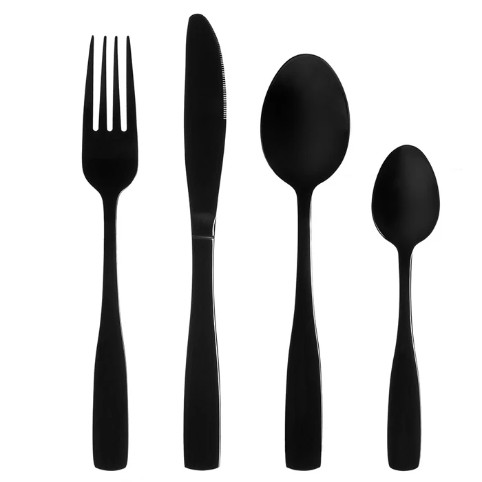 Nerūsējošā tērauda komplekts ar matēti melnu PVD pārklājumu; 4× nazis 22,5 cm, 4× dakša 19,8 cm, 4× karote 18,5 cm, 4× tējkarote 13,8 cm; biezums 2 mm; ieteicama roku mazgāšana.