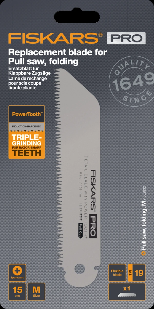 Fiskars Pro Power Tooth Pull zāģa asmenim ir pret iestrēgšanu drošs profils ar 19 TPI precīzai apdarei <br /> Tas ir lieliski piemērots precīziem, kontrolētiem griezumiem uz mīkstākas koksnes <br /> Plānais iegriezums garantē elastību ātrai un tīrai atzarošanai <br /> Ar indukciju rūdītie zobi nodrošina ilgstošu asumu <br /> Zemas berzes pārklājums paildzina asmens kalpošanas laiku ir izturīgs pret rūsu <br /> Piemērots Fiskars Pro Folding Detail Pull zāģim (prece nr. #1062932), kuram ir ērts sešstūru galvas skrūvju asmens nomaiņas mehānisms <br /> 19 TPI <br /> Asmens garums: 15 cm
