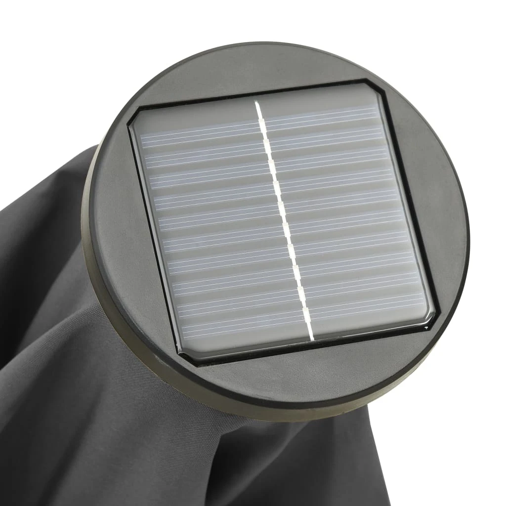 Pateicoties kloķim un grozāmajam dizainam, saulessargs ir saliekams un pārnēsājams. Tā jumtiņš ir izgatavots no poliestera, kas aizsargā no UV stariem un izbalēšanas, nodrošinot jums optimālu aizsardzību pret sauli. Izturīgais alumīnija kāts ar pulverkrāsas pārklājumu un 6 stingrās metāla līstītes palielina saulessarga stabilitāti, tādēļ tas ir īpaši izturīgs un kalpos daudzus gadus. Tam ir 12 LED gaismiņas, kas pēc saules norietēšanas skaisti izgaismos jūsu teritoriju, radot mājīgu un romantisku noskaņu.