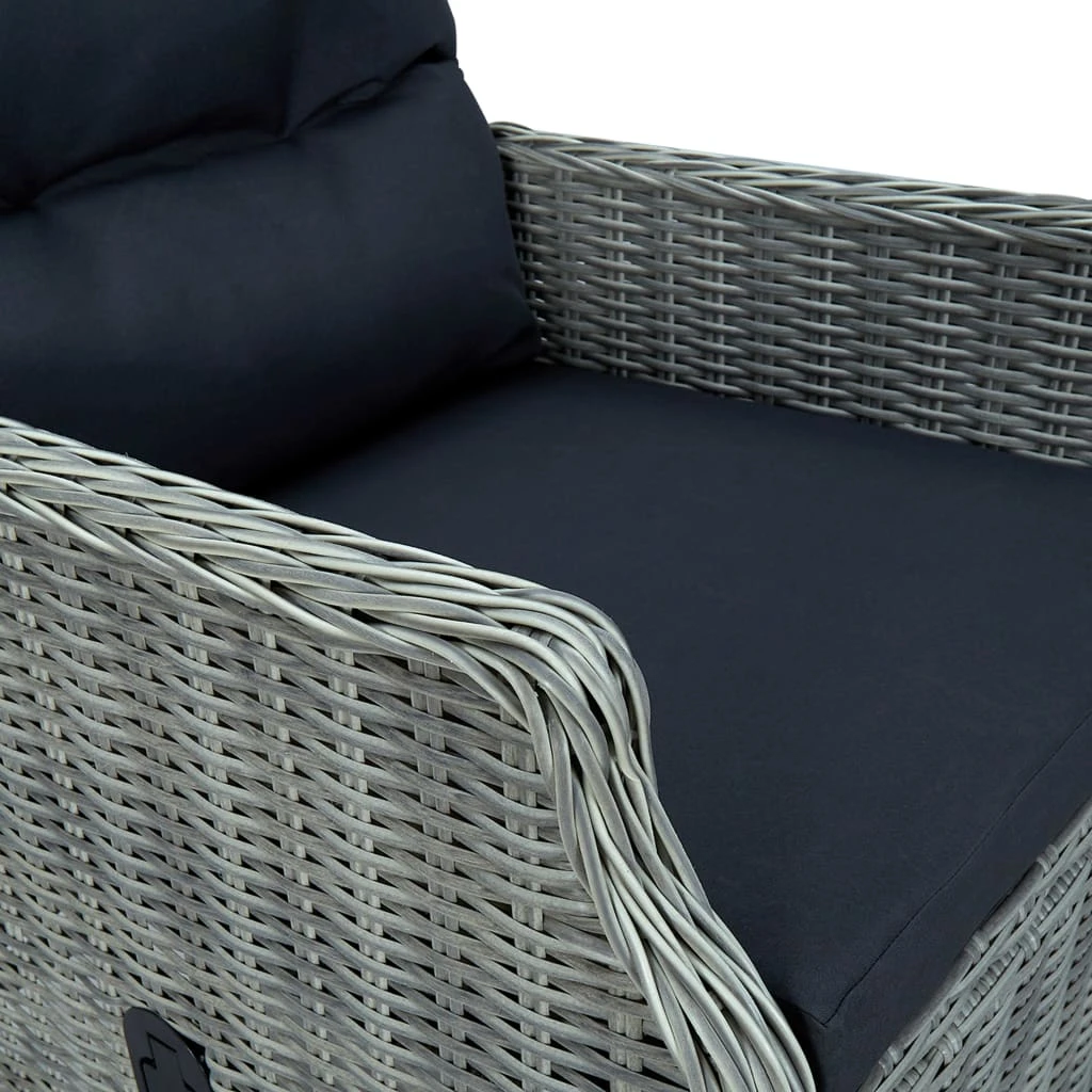 Mēbeļu komplekts ir izgatavots no vieglas un vienkārši kopjamas noapaļotas rotangpalmas imitācijas, tādēļ tas ir piemērots lietošanai ārpus telpām, un tā tīrīšanai nepieciešama vien mitra drāniņa. Pateicoties pulverkrāsotajam tērauda rāmim, krēsli un galds ir stabili un izturīgi. Uz masīvkoka galda virsmas jūs varēsiet pasniegt maltītes vai salikt dažādus dekoratīvus priekšmetus. Biezi polsterētie sēdekļu matrači ļaus baudīt īpaši ērtu atpūtu. Matraču pārvalkiem ir rāvējslēdzējs, un tos var noņemt un izmazgāt. Krēsliem ir gāzes pacelšanas mehānisms, kas ļaus noregulēt atzveltni dažādās pozīcijās. Lai pielāgotu krēslu jums ērtā pozīcijā, vienkārši nospiediet tā sānos esošo pogu un nolaidiet krēsla atzveltni.
