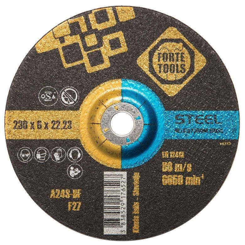 Zīmols- Forte Tools. Biezums- 6 mm. Diametrs- 230 mm. Iekšējā cauruma diametrs- 22.23 mm. Materiāls- Akmens. Apstrādes materiāls- Tērauds. Smalkums- 24 - 24. Maksimālais ātrums minūtē- 6650 rpm. Griešanas ātrums- 80 m/s. Piemēroti rīki- Slīpēšanas iekārtas.