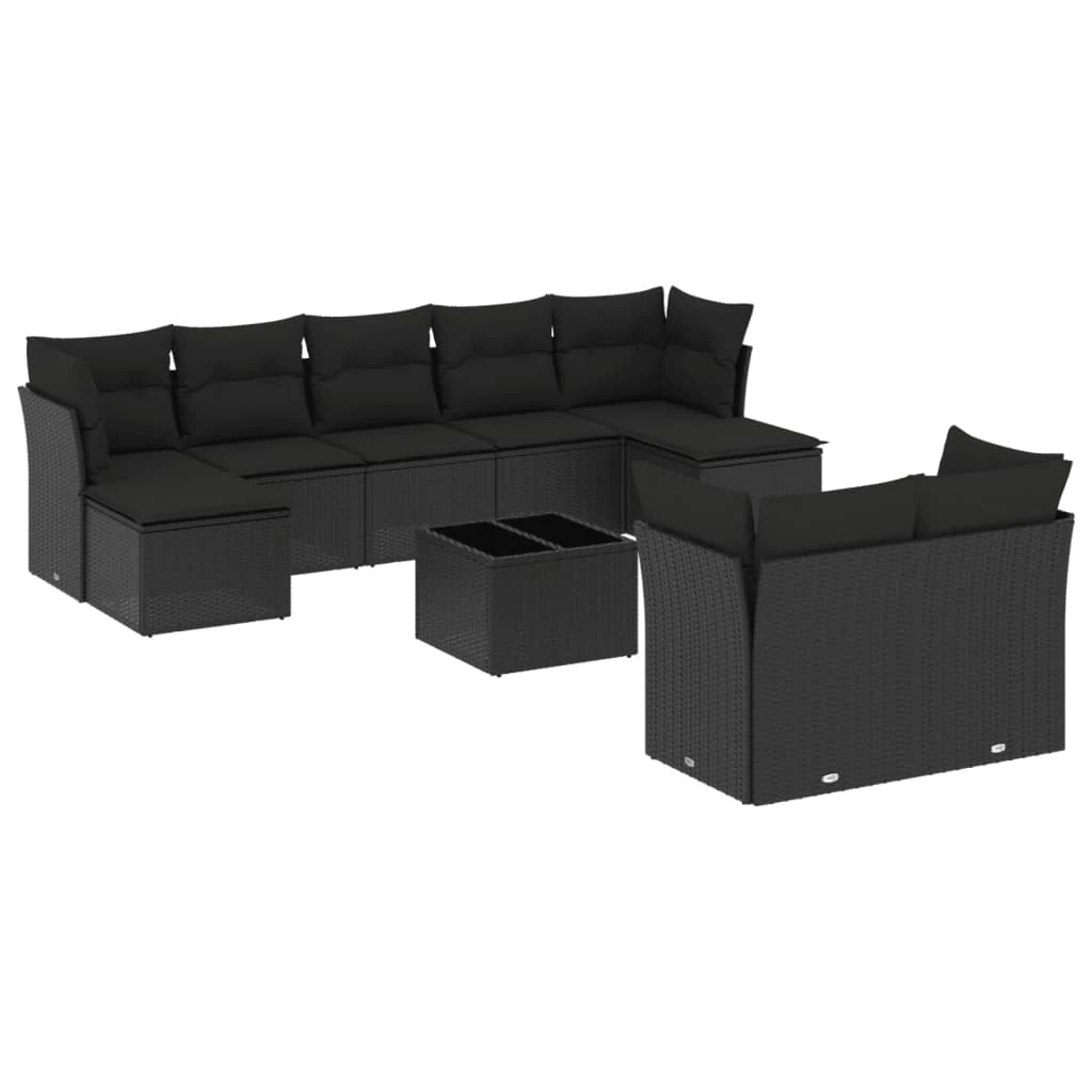 vidaXL 10-daļīgs dārza dīvāna komplekts, matrači, melna PE rotangpalma