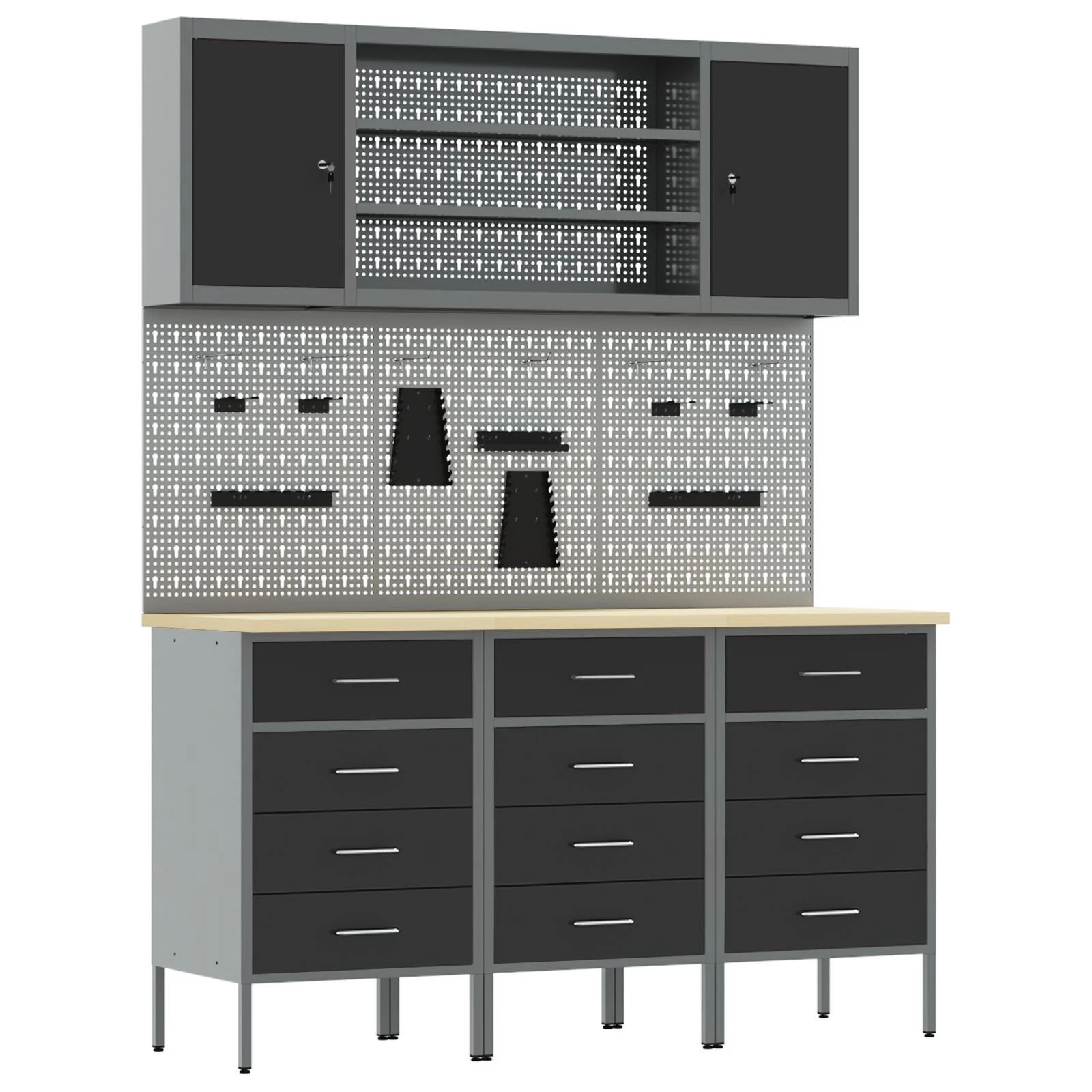 Šis mūsdienu darba skapis apvieno formu un funkciju, saglabājot izturīgu dizainu un industriālo stilu. Tas ir ideāli piemērots darbnīcām un izliekas tiešām eleganti. Konstrukcija izmanto koku un tēraudu un ir ideāli piemērota rīku organizēšanai un darba vides uzlabošanai, gan hobiju, gan profesionāliem lietotājiem.