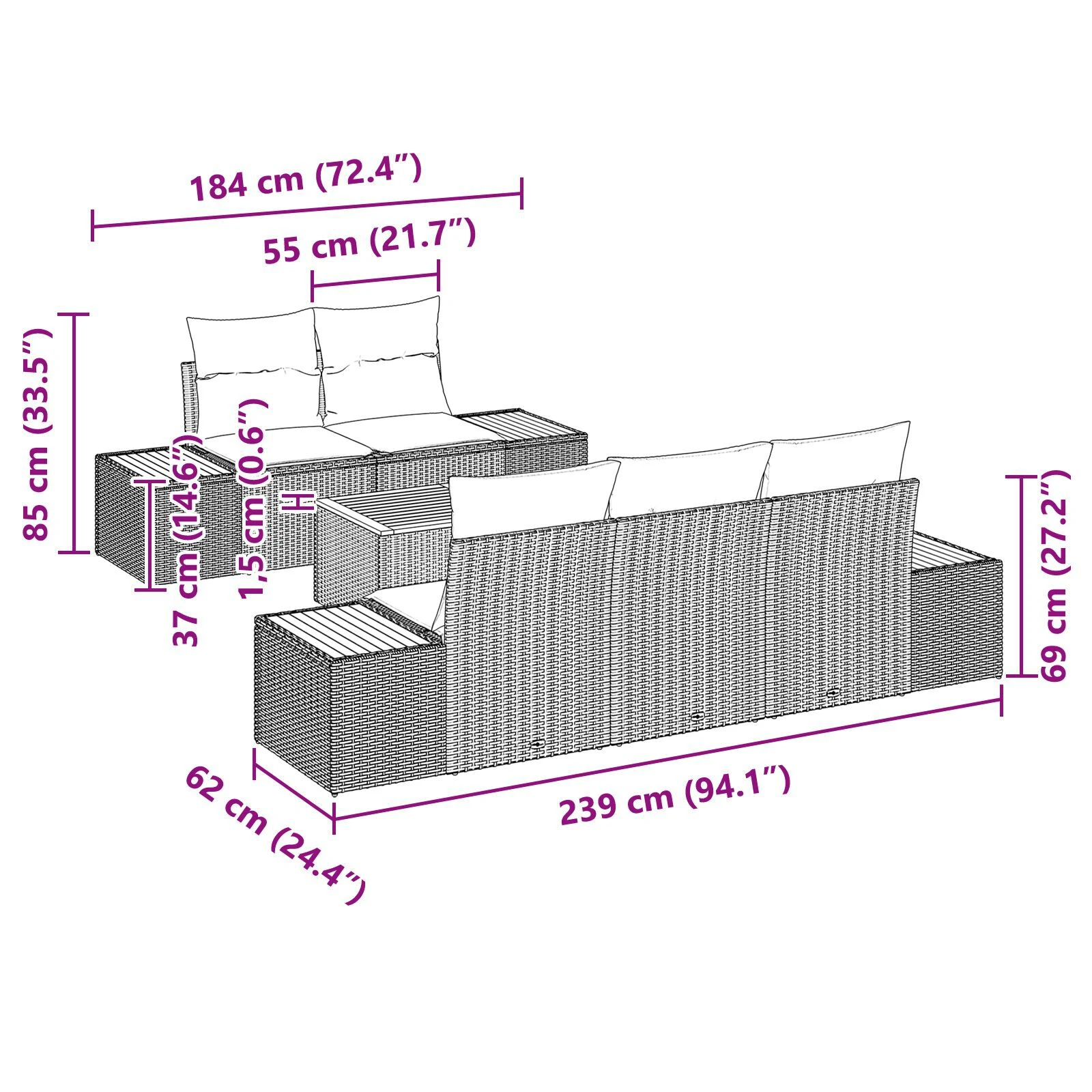 Šis dārza dīvānu komplekts piedāvā modernu un funkcionālu papildinājumu jebkurai āra telpai, apvienojot mūsdienīgu dizainu ar praktiskām iezīmēm. Tas ir domāts tiem, kas novērtē tīras līnijas un efektīvu telpas izmantošanu, un palīdz pārvērst terases un dārzus par modernām izklaides vietām vai atpūtas oāzēm. Komplekts apvieno ērtību un stilu ar plānu rāmi un komfortablām sēdvietām, aicinot jūs atpūsties un izbaudīt ārā.