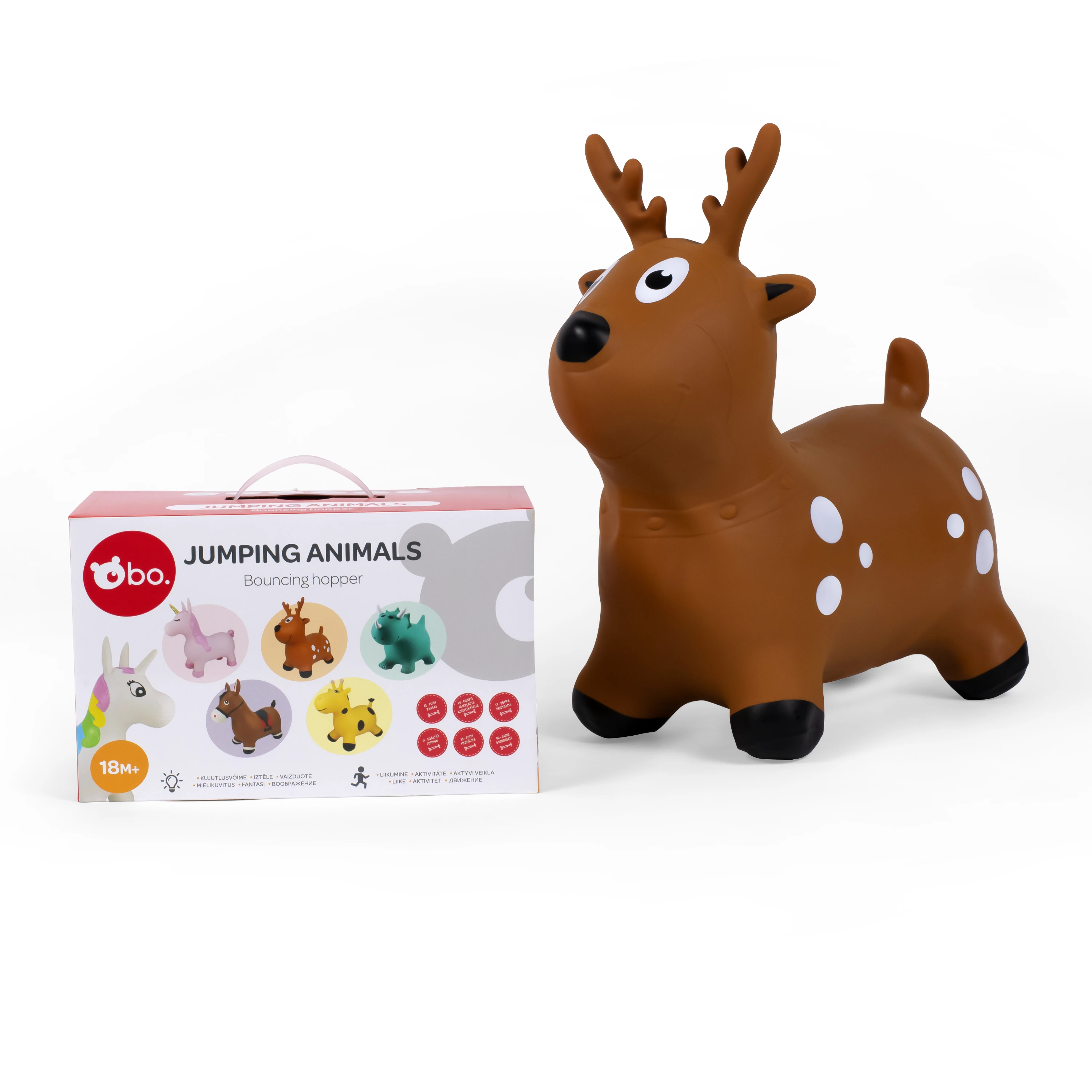 bo. Lēkājošie dzīvnieki, kas veicina fizisko aktivitāti un jautrā veidā attīsta labāku līdzsvaru. Dzīvniekiem ir lielas ausis vai ragi, lai tos būtu viegli satvert, un izturīgas kājas, lai lēkāšana būtu stabila! Var izmantot jautrai lēkāšanai gan telpās, gan ārā. Izvēlieties sev tīkamāko un lēkājiet prom! Pumpis ir iekļauts komplektā. Maksimālais svars - 50 kg. Vecums: 18M+