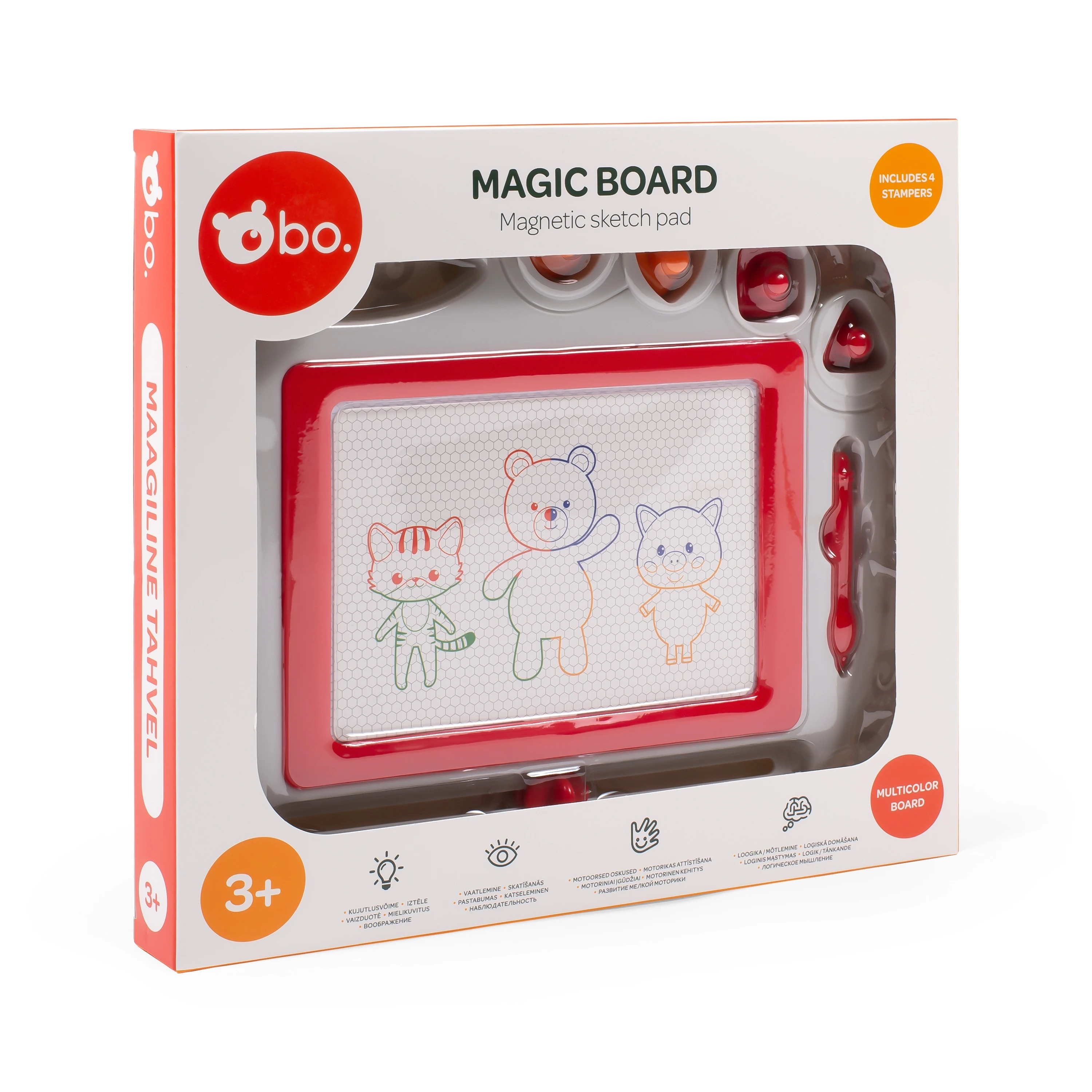 Šī bo. magnetic zīmēšanas tāfele iepazīstina bērnu ar mākslas pasauli! Vienkārši paņemiet magnētisko zīmuli un sāciet zīmēt! Un, kad esat pabeiguši mākslas darbu, noslaukiet tāfeli un sāciet no sākuma! Vēlaties izklaidi padarīt vēl interesantāku? Paņemiet magnētiskos zīmodziņus un atspiediet tos uz tāfeles - uz tās parādīsies dažādas jautras formiņas! Tāfeli vēl īpašāku padara četru krāsu fons - uz tā ir vēl interesantāk zīmēt! Magnētiskās tāfeles izmērs ir 27x22cm un tāfele ideāli ietilpst katra bērna mugursomā, lai ceļā nebūtu jāgarlaikojas!