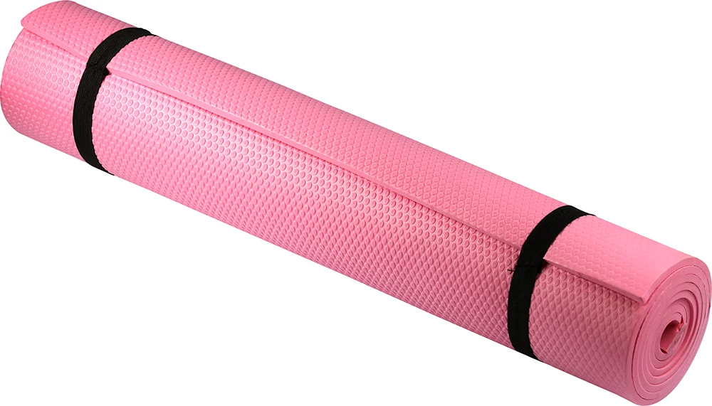 Jogas paklājs rozā krāsā ar siksnu uzglabāšanai. Paklāja garums 180 cm, platums 60 cm, biezums 0.6 cm.