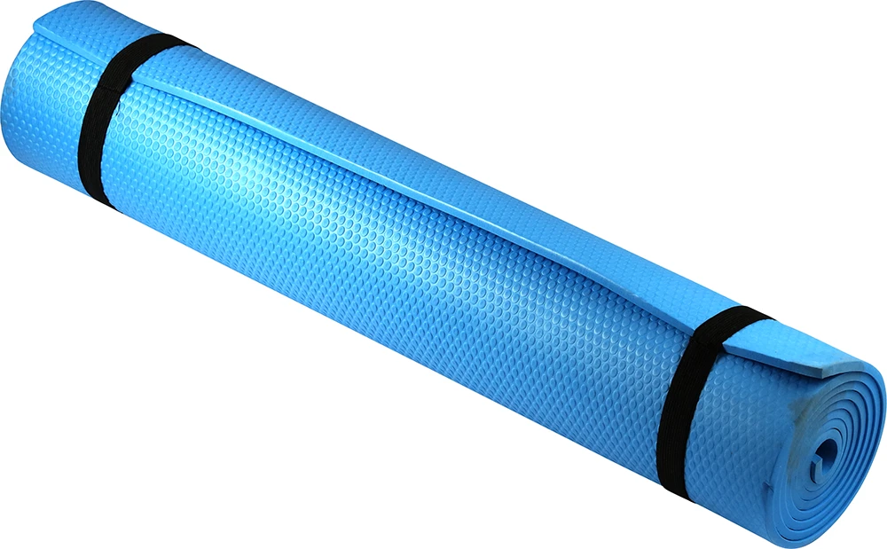 Jogas paklājs zilā krāsā ar siksnu uzglabāšanai. Paklāja garums 180 cm, platums 60 cm, biezums 0.6 cm.
