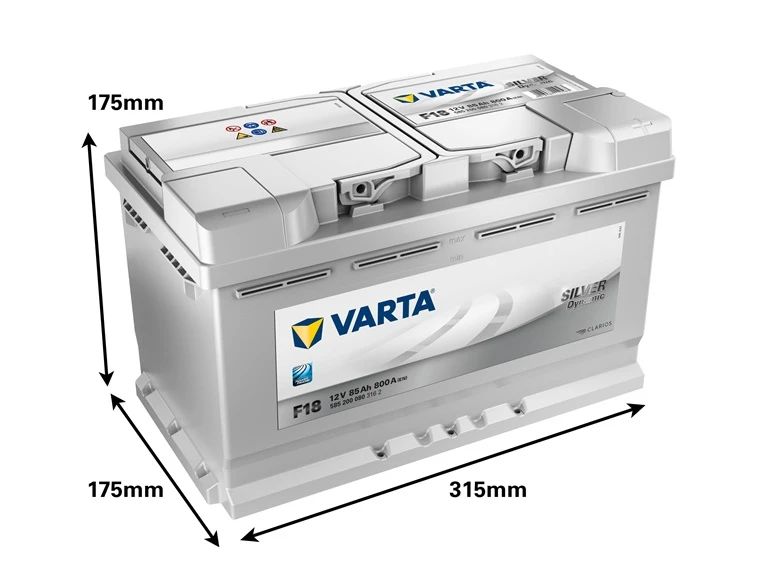 Zīmols- Varta. Modelis- SLI F18. Akumulatora tips- Svina skābes. Akumulators paredzēts- Automobiļiem. Spriegums- 12 V. Akumulatora kapacitāte- 85 Ah. Startēšanas strāvas jauda- 800 A. Polaritāte- - + . Garums- 31.5 cm. Platums- 17.5 cm. Augstums- 17.5 cm. Svars- 18.79 kg. Obligātā garantija- 24 mēn. Papildus informācija- Silver Dynamic.
