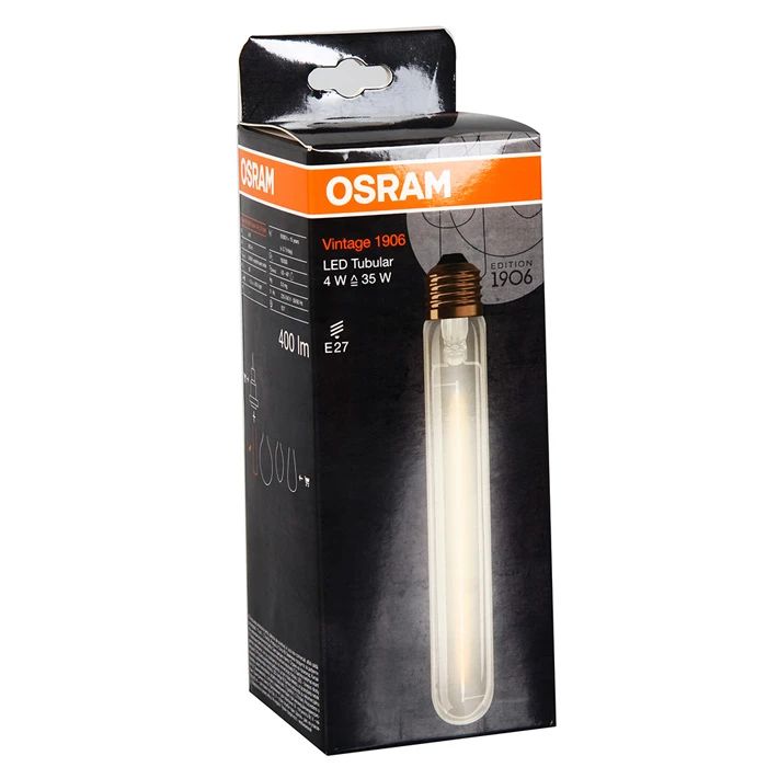 Produkta veids- LED spuldzes. Artikuls- nera. Zīmols- Osram. Spuldzītes tips- LED. Garums- 185 - 185mm. Platums- 32 - 32mm. Augstums- 32 - 32mm. Spriegums- 220 - 240V. Cokols- E27. Gaismas plūsma- 400 - 400lm. Spuldzītes forma- Lineārs. Apgaismojuma krāsa- Silti balta. Krāsas temperatūra- 2000 - 2000°K. Virsmas/stikla veids- Vintāžas. Lampas apgaismojuma regulators- Nē. Spuldzītes apzīmējums- E27. Spuldzītes efektivitāte- 100 lm/W. Enerģijas patēriņš. kWh/1000 h- 4. Vidējais nominālais ekspluatācijas laiks- 15000 h. Obligātā garantija- 24 mēn. Garantija juridiskām personām- 12 mēn.
