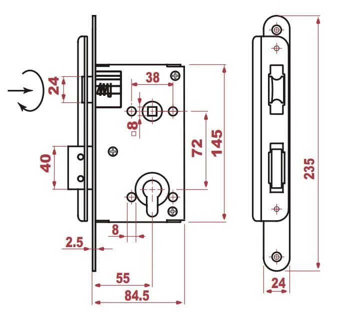 Zīmols- Kurzemes. Modelis- 481Z. Slēdzenes tips- Iekšdurvju. Ārdurvju. Attālums starp rokturi un cilindra gropes centru- 72 mm. Attālums no slēdzenes malas līdz cilindra centram- 55 mm. Pārklājums- Cinkots. Materiāls- Metāls. Atvēršanas virziens- Universāla. Obligātā garantija- 24 mēn. Komplekts- Slēdzene bez rokturiem un cilindra. Garantija juridiskām personām- 12 mēn. Papildus informācija- Iekšdurvīm un ārdurvīm no koka.