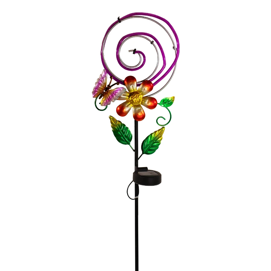 Dārza dekors ar solāro gaismu ir košs un praktisks papildinājums dārza apgaismošanai vai dekorēšanai. Metāla dekors ar spilgtu ziedu un tauriņu akcentiem piesaista uzmanību un diennakts tumšajā laikā rada patīkamu noskaņu ar integrēto solāro apgaismojumu. Izgatavots no kvalitatīva metāla un plastmasas, izturīgs pret dažādiem laikapstākļiem. Izmērs 90.5 x 20.2 x 4.3 cm.