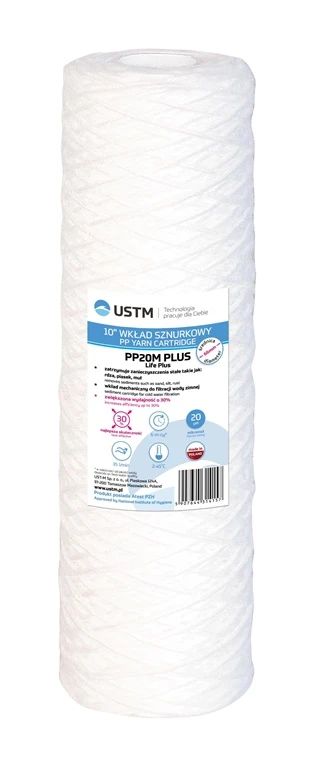 Zīmols- USTM. Modelis- PP20M PLUS. Filtra kasetes tips- Polipropilēna pavedieni. Filtrēšanas materiāls- Polipropilēns. Piemērots dzeramajam ūdenim- Jā. Darba temperatūra- 2 - 45°C. Caurplūdes koeficients- 1500 l/h. Diametrs- 55 mm. Garums- 255 mm. Papildus informācija- Pirms lietošanas izskalojiet kaseti. līdz pazūd putošanās..