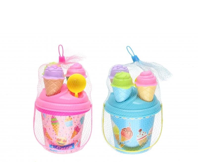 Komplektā ir spainis un dažādi aksesuāri smilšu saldējumu veidošanai. Komplektā 3 saldējuma konusa un 3 piedevas un lāpstiņa. Izgatavots no plastmasas, nav toksisks.