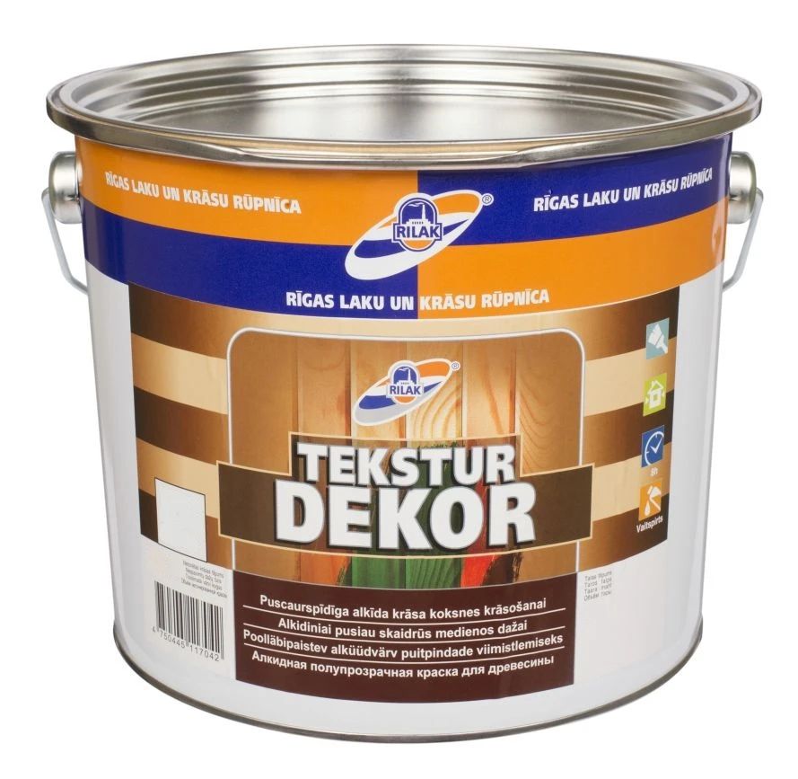 Zīmols- Rilak. Apdares darbiem- Āra. Iepakojuma daudzums, l- 10. Atšķaidītājs- Vaitspirts. Krāsa- Brūna. Patēriņš- 4-11 m²/l. Īpašības- Krāsa veido plānu daļēji caurspīdīgu (nepārklājot koka struktūru) un ūdeni atgrūdošu hidrofobu plēvi.. Žūšanas laiks (pirms pieskaršanās)- 8 - 8h.
