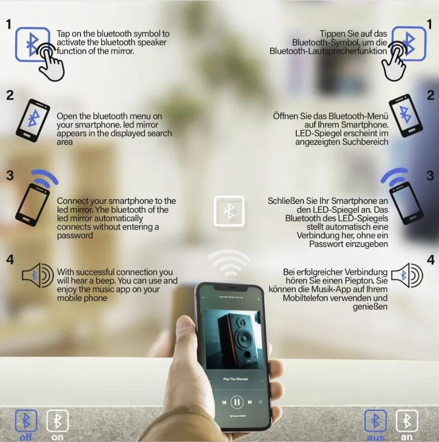 LED illuminated bathroom mirror with touch control; adjustable light temperature (cold/neutral/warm), built-in digital clock, Bluetooth speaker, and cosmetic magnifying mirror.