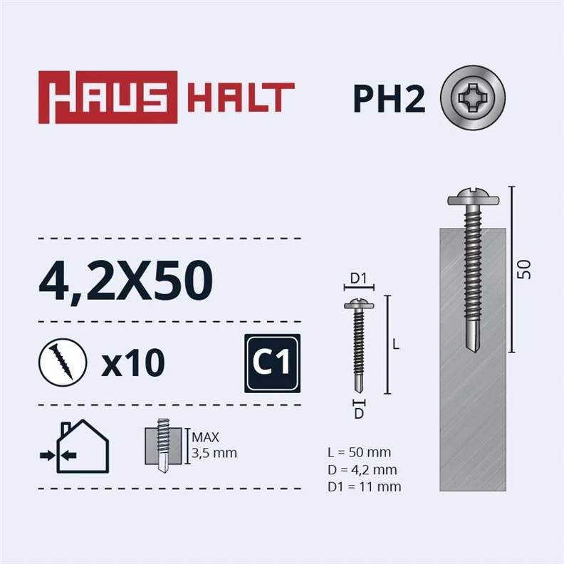 Preču zīmols- Haushalt. Pašvīdēšanas skrūves tips- Ar urbju. Garums- 50 mm. Diametrs- 4.2 mm. Pārklājums- Cinkots. Piestiprināmā materiāla- Metāls. Standarts- DIN 14566. Vienības iepakojumā- 10. Papildu informācija- Pārklājums: cinkots. Pašvīdēšanas skrūvju tips: ar uzgriezni. Elementa tips: pašvīdēšanas skrūve.