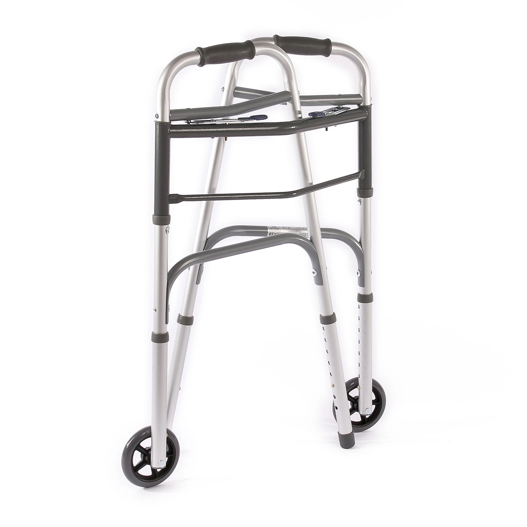 The frame has 12.5 cm front wheels and is sold fully assembled and ready to use. To unfold it, hold the padded armrests and gently bend both supports in opposite directions until you hear a click and the frame takes on a semi-circular shape. When folding the frame, press down on the plastic holder at the top and fold both sides of the frame inward. As you walk, lift the back legs of the frame slightly and push. Try to stand straight, symmetrically.