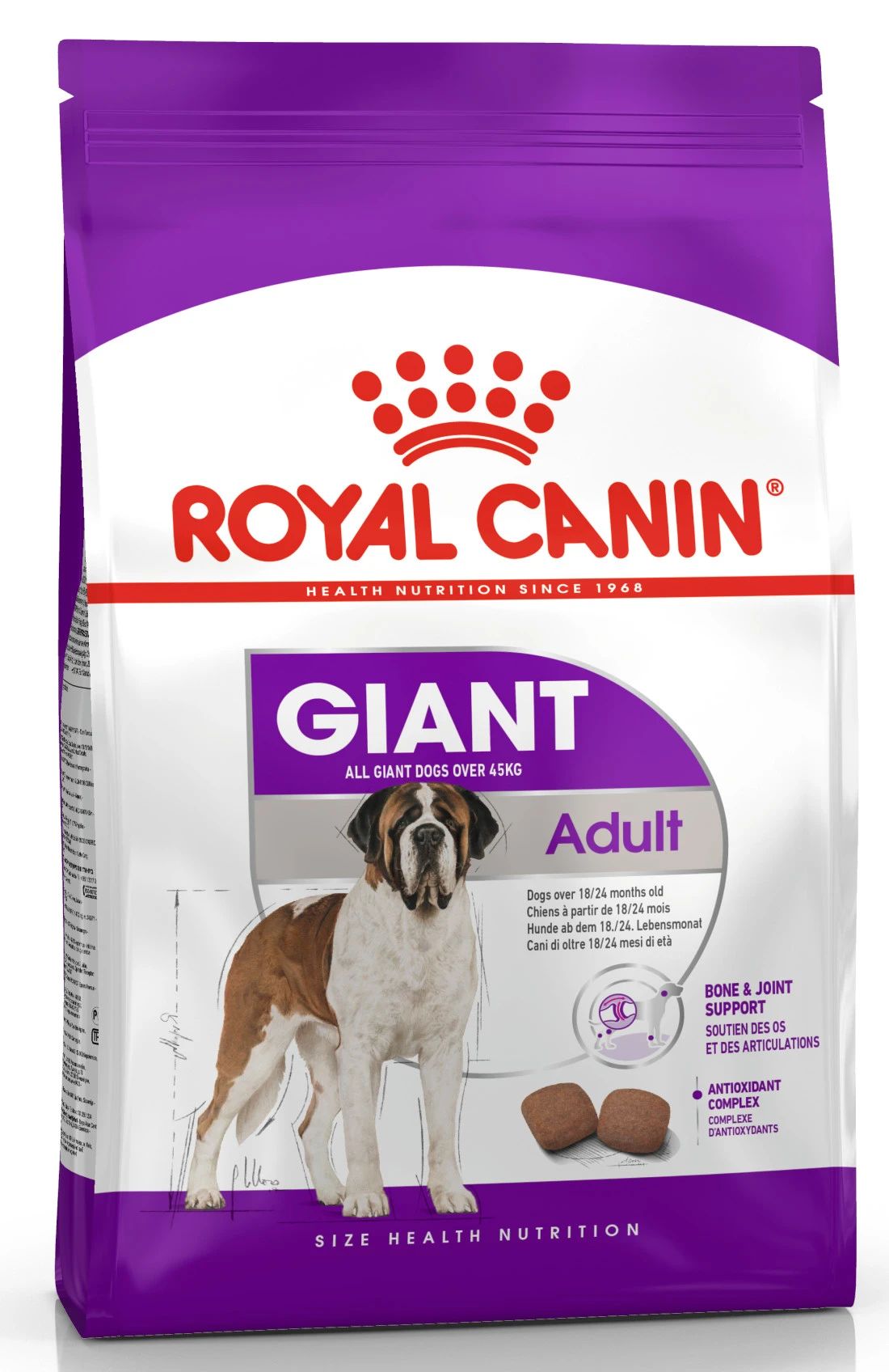 Zīmols- Royal Canin. Modelis- Giant Adult. Barības kvalitātes līmenis- Super premium. Svars- 15 kg. Barība suņiem- Pieaugušajiem. Suņa izmērs- Lieliem suņiem. Pamatsastāvs- Vistas gaļa. Sastāvs- SASTĀVS: dehidrēts mājputnu proteīns, kukurūza, kukurūzas milti, dzīvnieku tauki, kvieši, rīsi, hidrolizēti dzīvnieku proteīni, kukurūzas lipeklis, biešu mīkstums, augu proteīna izolāts*, zivju eļļa, minerālvielas, dārzeņu šķiedras, sojas eļļa, raugi un to daļas, gurķeņu eļļa, hidrolizēti vēžveidīgie (glikozamīna avots), samteņu ekstrakts (luteīna avots), hidrolizēti skrimšļi (hondroitīna avots).. Papildus informācija- Pilnvērtīga barība lielo šķirņu suņiem (ar ķermeņa masu, kas lielāka par 45 kg) pēc 18–24 mēnešu vecuma..