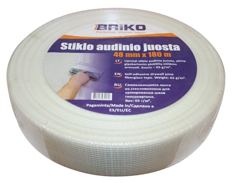 Zīmols- Briko. Lentas materiāls- Stikla šķiedras. Ruļļa garums- 180 m. Platums- 48 mm. Svars, g/m²- 65. Lietošanas nosacījumi- Iekšējās telpas.