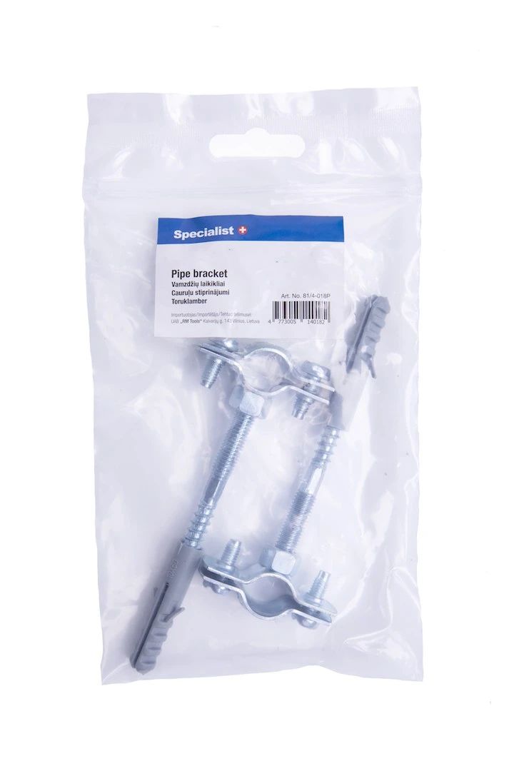 Robust galvanised pipe holders, without rubber gasket. For fixing all metal and plastic pipes. Suitable for both vertical and horizontal pipe mounting. Includes clamp, stud and pin.