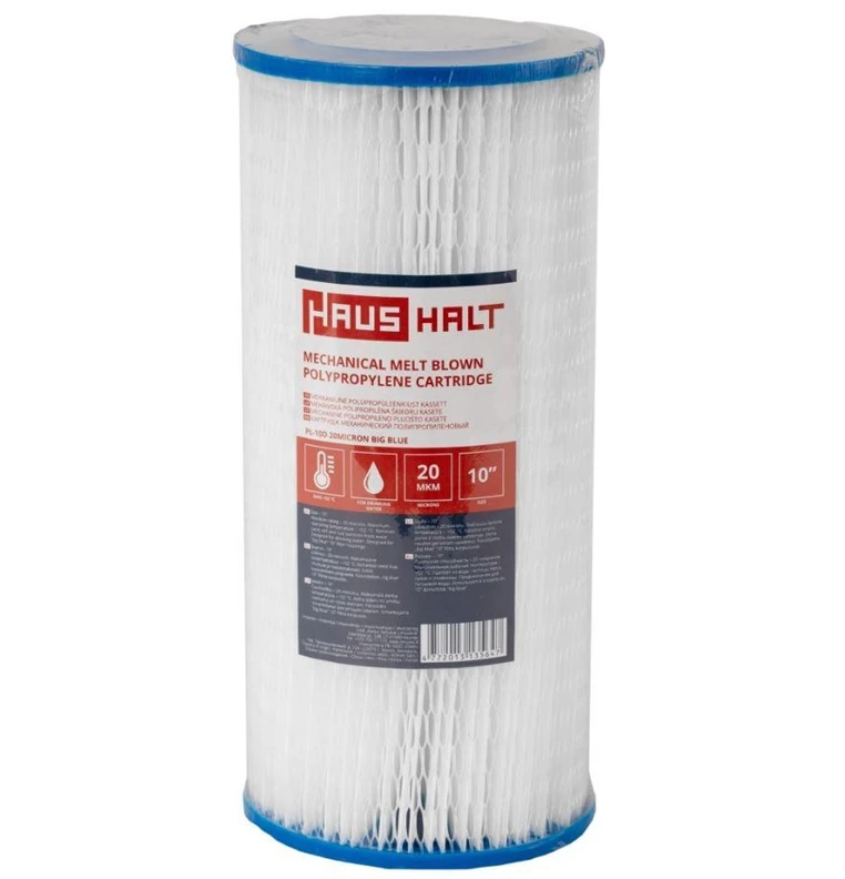 Preču zīmols- Haushalt. Modelis- Big Blue PL-10D. Filtra kasetes tips- Mehāniskā tīrīšana. Filtrēšanas materiāls- Polipropilēns. Mazākās filtrējamās cietās daļiņas- 20 mikroni. Piemērots dzeramajam ūdenim- Jā. Darba temperatūra- 1 - 48°C. Caurlaidība- 840 l/h.