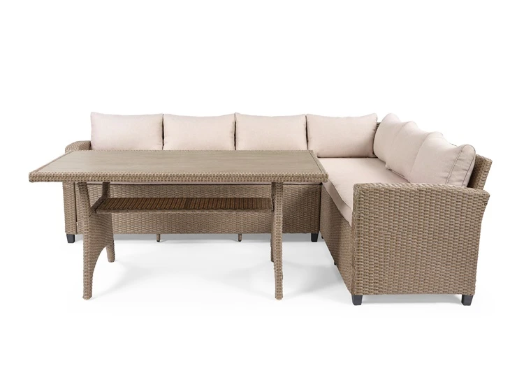Zīmols- Domoletti. Sēdvietu skaits komplektā- 6 - 6. Galda garums- 144 - 144cm. Galda augstums- 68 - 68cm. Galda platums- 74 cm. Salokāms galds- Nē. Ar lietussarga caurumu- Nē. Ar roku balstiem- Jā. Mēbeles rāmja materiāls- Tērauds. Dīvāna garums- 169 - 179cm. Dīvāna platums- 68 cm. Dīvāna augstums- 73 cm. Apdares materiāls- Rotangpalma. Mēbeļu komplekta krāsa- Brūns. Āra mēbeļu komplekta daļas- Sešvietīgs stūra dīvāns, 1 kafijas galdiņš. Mēbeļu spilveni iekļauti komplektā- Jā. Mēbeļu spilvenu pildījums- Putu poliuretāns. Mēbeļu spilvenu pārvalks- Poliesters. Obligātā garantija- 24 mēn.