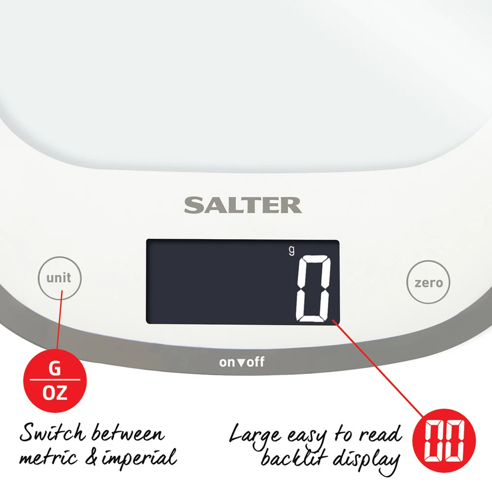 Elegantie un praktiskie Salter Curve elektroniskie svari ir arī lielisks mērtrauku aizstājējs, izmantojot funkciju Aquatronic.