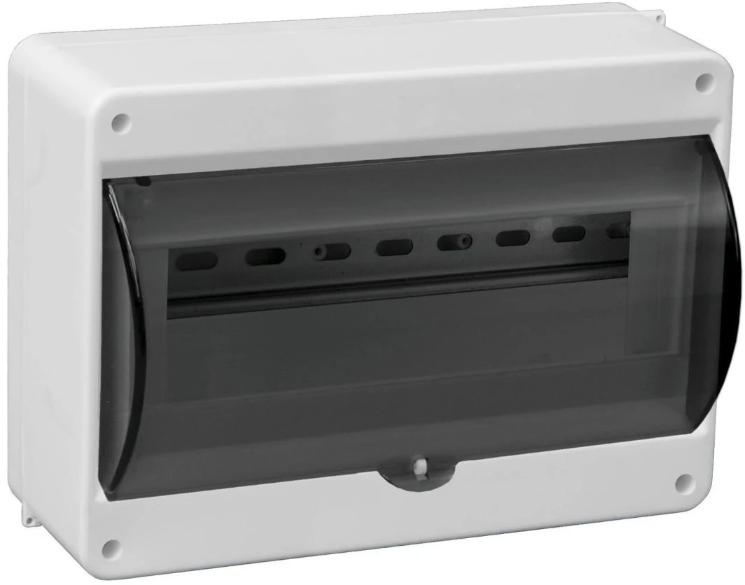 Virsapmetuma sadales skapis ar durvīm 12 moduļiem 1 rindā. Izgatavots no izturīgas ABS plastmasas. Slēgts kārbas korpuss, pielāgota blīvēšanai. Izmērs 240 x 140 x 96 mm.